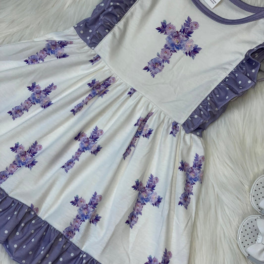 White & Purple Cross Printed Ruffle Sleeve Dress