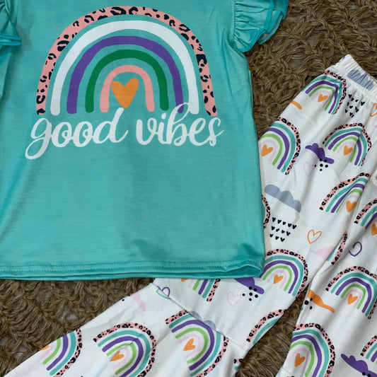 Good Vibes Rainbow Graphic Ruffle Tee and Bell Pants
