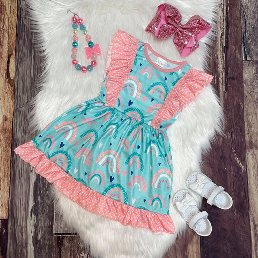 Aqua Blue Rainbow Printed Ruffle Dress